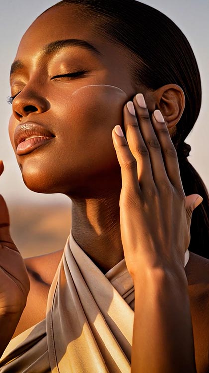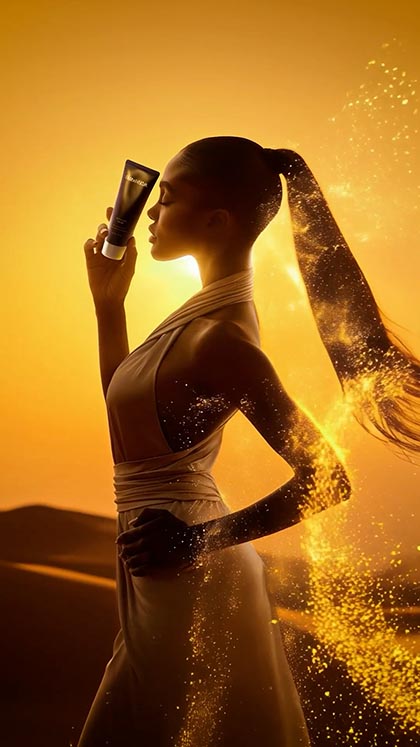 루미도르를 소개하는 1분 내외의 AI 영상으로, 피부를 밝혀주는 제품의 특장점을 황금빛 사막과 태양의 이미지로 표현합니다. 모델이 제품을 사용하는 장면을 통해 피부의 변화를 직관적으로 보여주고, 사용 후에는 파워풀한 동작과 흩날리는 천을 통해 강렬한 에너지와 힘을 전달합니다.