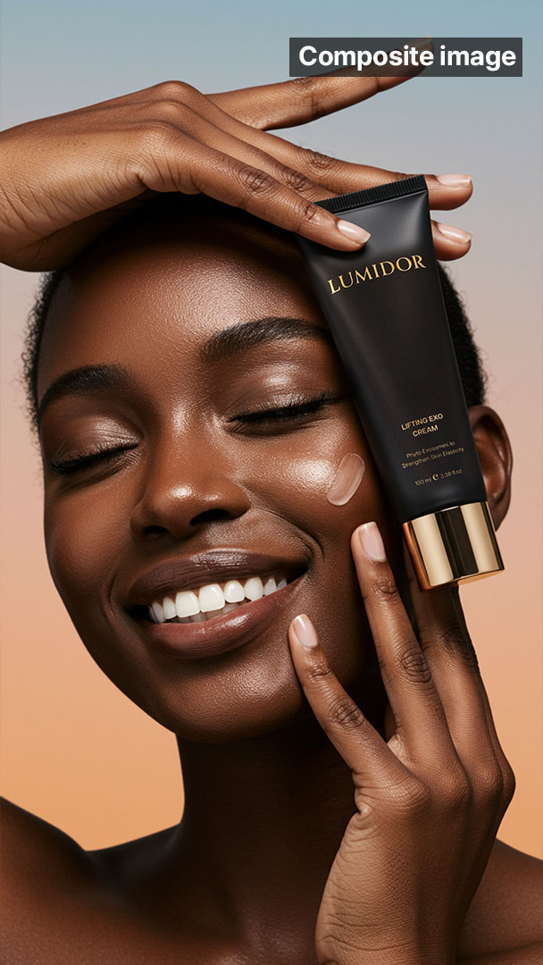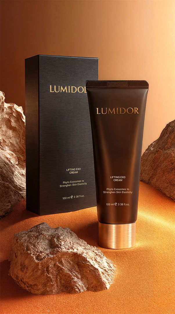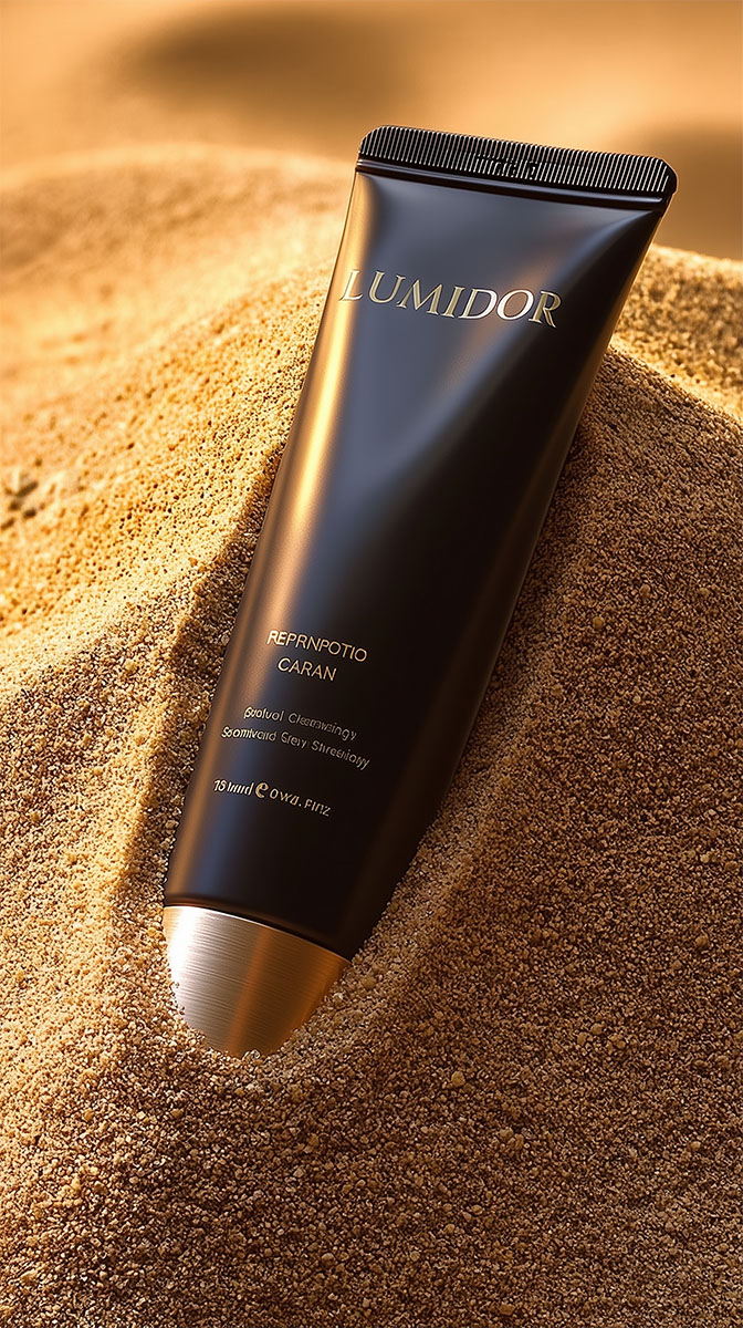 An AI video, approximately 1 minute long, introducing Lumidor. The product’s key feature of brightening the skin is expressed through imagery of a golden desert and the sun. The video intuitively shows the skin’s transformation through scenes of a model using the product, and after application, conveys intense energy and power through powerful movements and flowing fabric.