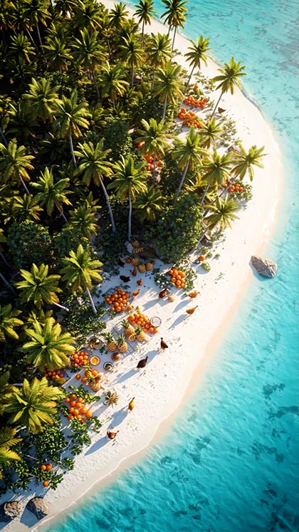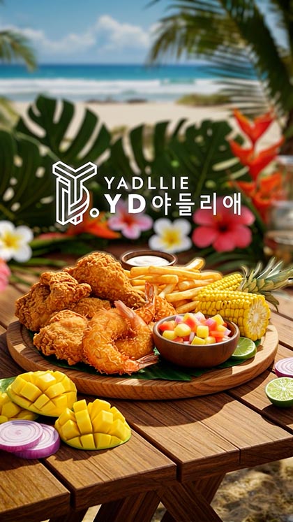야들리애의 메뉴인 알로라 플래터를 소개하는 20초 내외의 AI 영상입니다. 푸른 바다와 야자수, 모래사장에서 펼쳐지는 여름 휴양지의 분위기를 담아내어 알로하 플래터가 선사하는 즐거움과 이국적인 감성을 유니크하게 연출하였습니다.